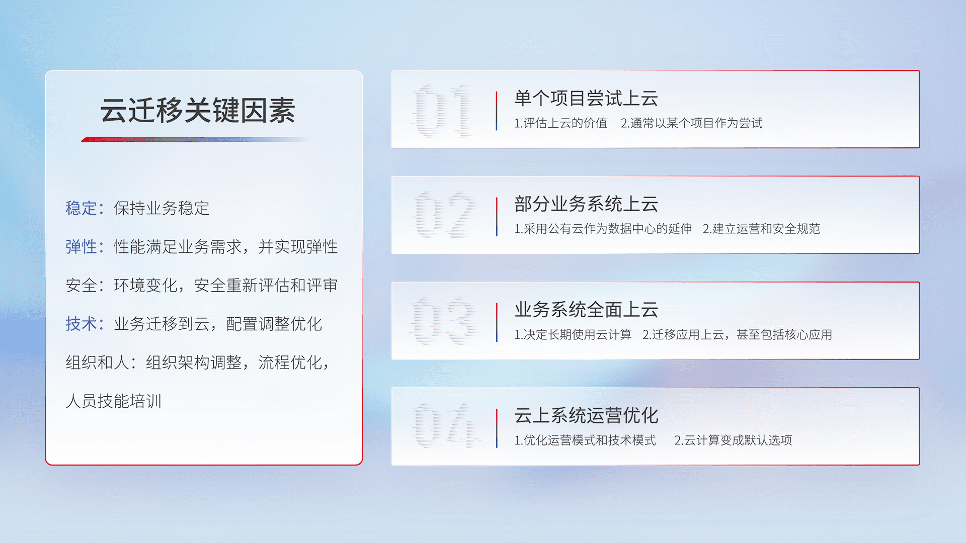 结合实际业务,,,从规划设计、、、、云平台选型、、、云原生改造、、数据迁移、、集成交付,,迁移全过程为客户识别最佳上云路径,,,做好风险识别管理,,,设计网络架构、、、、身份权限、、安全审计合规、、操作审计、、、、日志审计、、监控告警策略、、多站点容灾设计等,,对云上基础设施进行整体规划,,提升IT治理水平,,以满足弹性、、高可用、、高性能的需求。。。