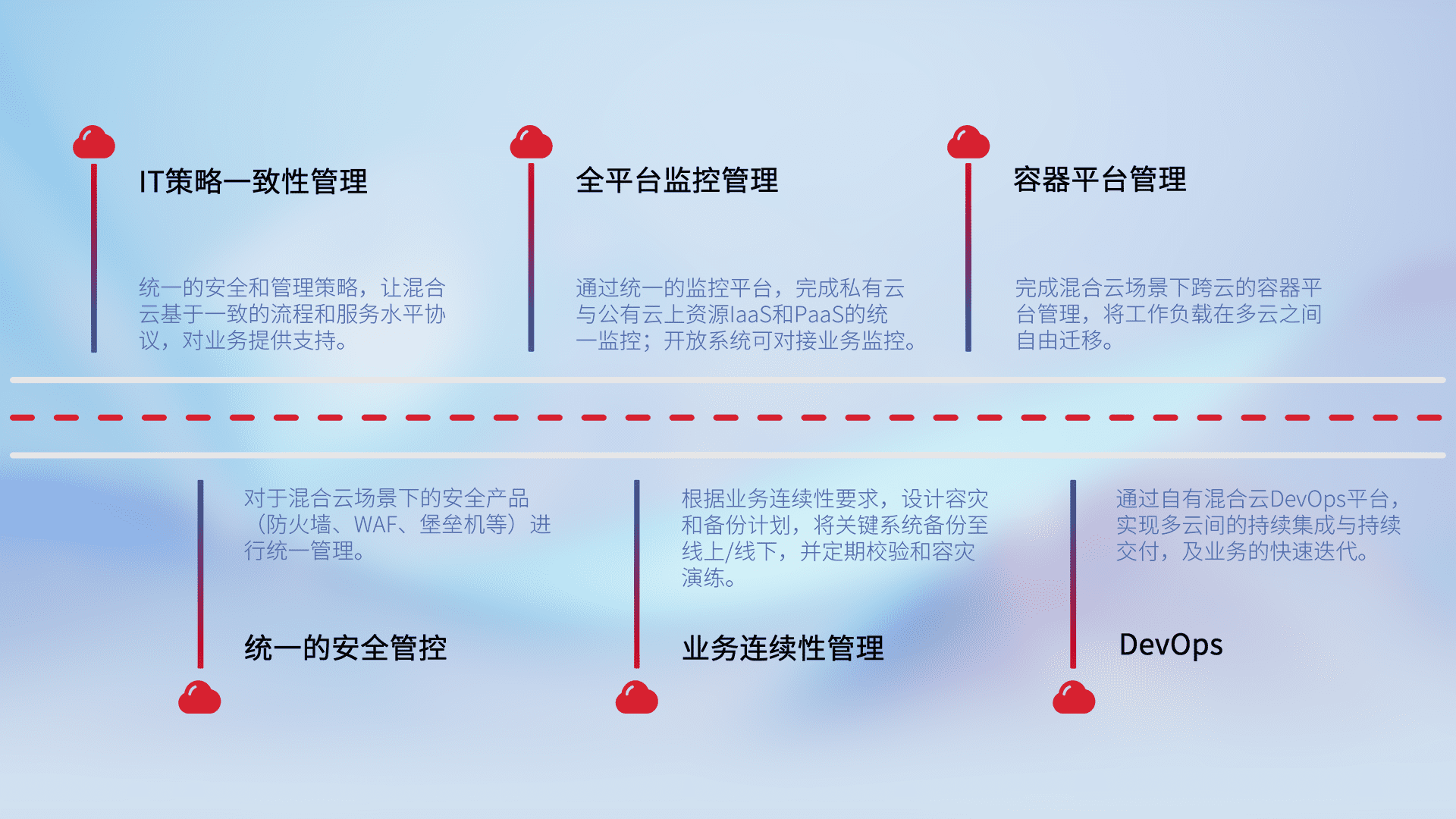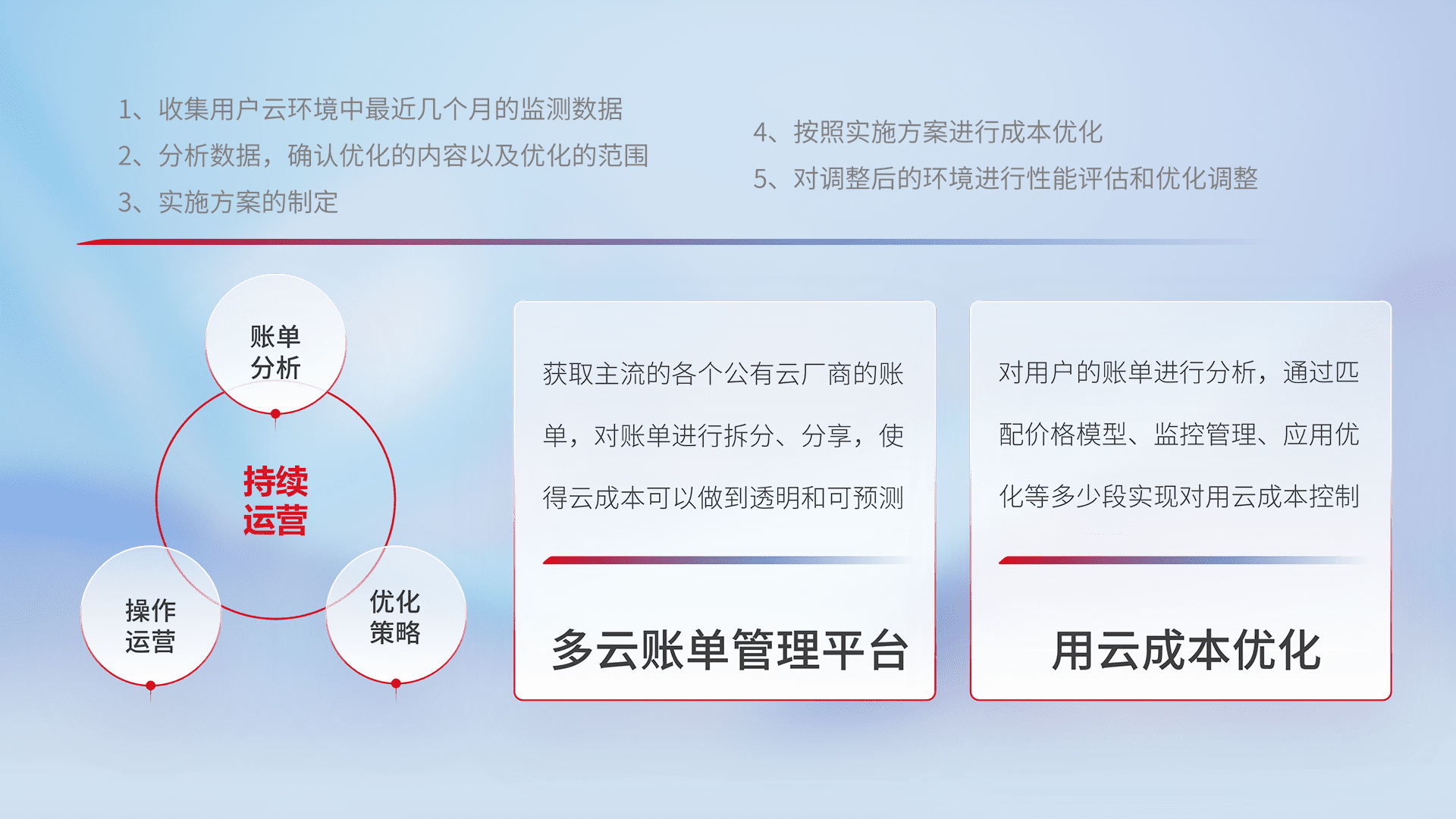 通过多云纳管,,,,以统一的资源数据模型把客户的云资源进行抽象和封装,,,,进而实现对多云资源的统一操作,,保障云资源管理的可靠性、、、、稳定性与可用性。。。。量身定制化运维内容,,配置、、、开发运维、、补丁管理、、、备份、、、、监控、、、、认证和访问管理、、、审计和日常巡检等,,,,保障在用云过程中的可靠度,,,,稳定度以及高可用率。。。。