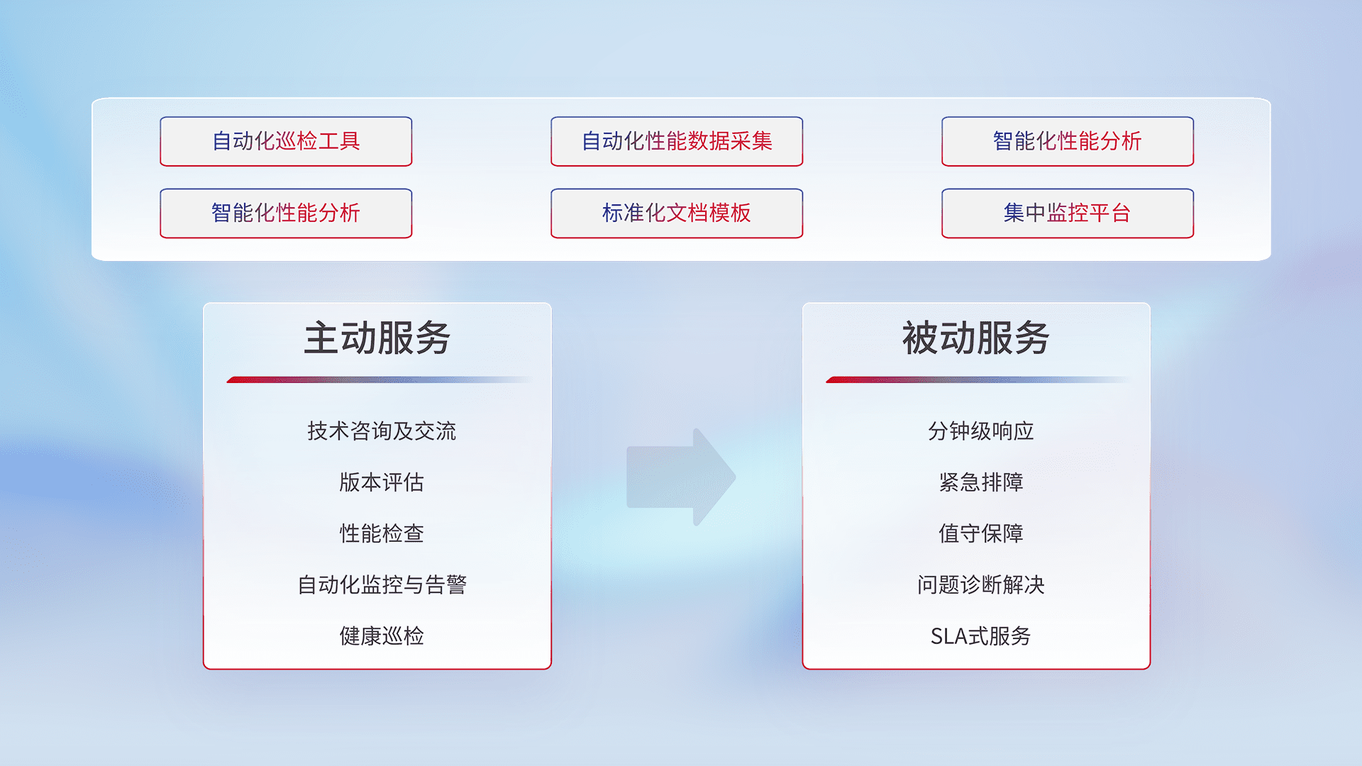 智能化工具和标准化文档,,保障服务质量,,,,提供主动服务(包含技术咨询、、、、版本评估、、、性能检查、、、自动化监控与告警、、、、健康巡检)和被动服务包含(分钟级响应、、、、紧急排障、、、值守保障、、问题诊断解决、、SLA服务)。。。