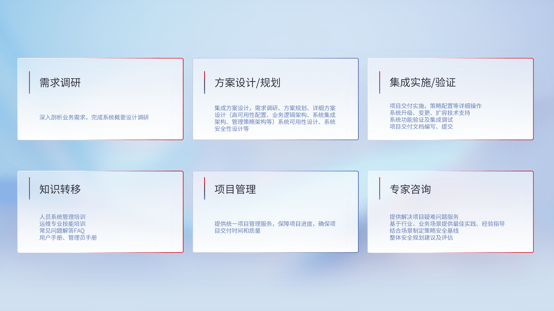 针对客户行业特性,,将宏观的安全战略和需求,,,通过专业的交付服务,,,,实现项目落地,,,,为客户提供标准规范的集成交付服务。。