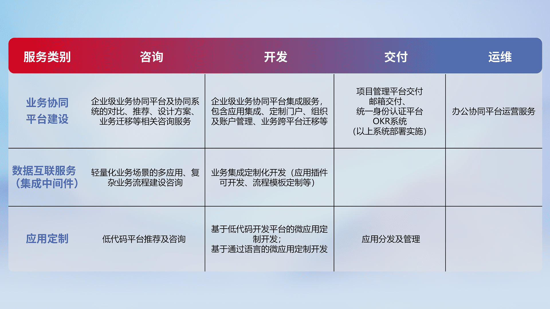针对钉钉、、企微、、IDaas等平台级产品提供产品的规划、、、方案、、交付、、定制化开发等服务,,,,实现如统一协同办公、、、智能客户服务、、、混合会议管理、、、、智能数据查询、、等业务场景,,,,实现数字化转型。。。